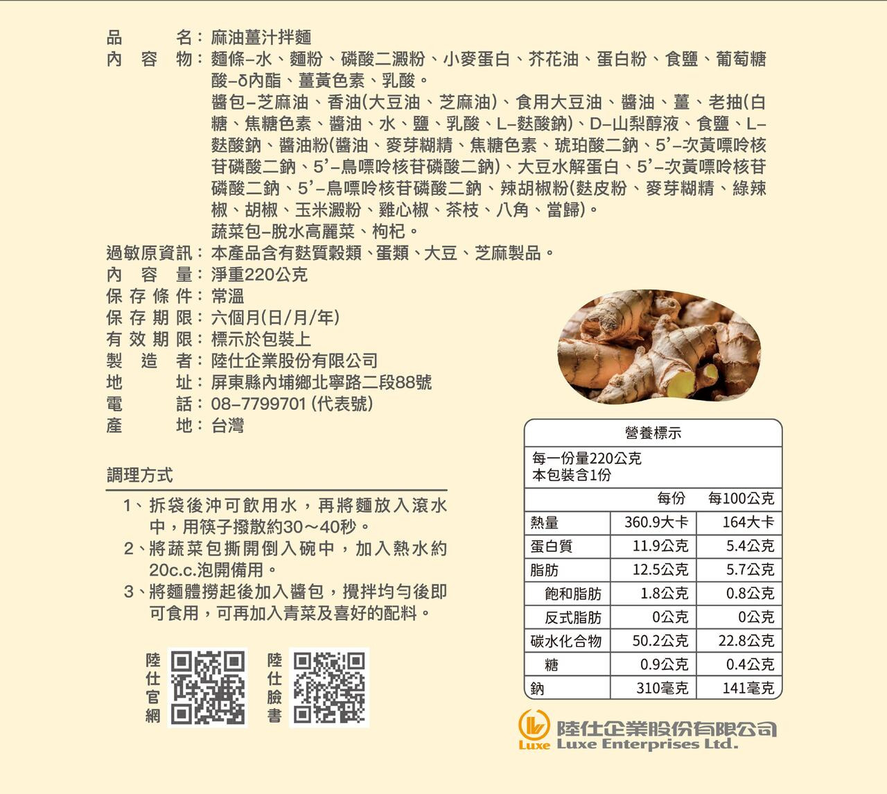 【陸仕麵館】愛麵族|平安祈福拌麵-麻油薑汁 220g (蛋素)